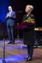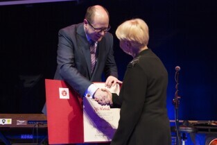 Gala Nagrody Miasta Gdańska w Dziedzinie Kultury "Splendor Gedanensis". Gdańsk, Europejskie Centrum Solidarności. Nz. Zofia Watrak, nagrodę wręcza Prezydent Gdańska Paweł Adamowicz