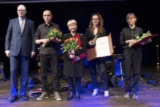 Gala Nagrody Miasta Gdańska w Dziedzinie Kultury "Splendor Gedanensis". Gdańsk, Europejskie Centrum Solidarności. Nz. od lewej: Prezydent Gdańska Paweł Adamowicz, Adam Witkowski, Zofia Watrak, przedstawicielka Dr Irena Eris S.A., Anna Witkowska