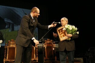 Gdańsk, Teatr Wybrzeże. Nagrody Miasta Gdańska w Dziedzinie Kultury "Splendor Gedanensis" za rok 2009, które wręczył Prezydent Gdańska Paweł Adamowicz. Nagrodę odbiera Hugon Lasecki - za wystawę retrospektywną w Oddziale Sztuki Nowoczesnej Muzeum Narodowego w Gdańsku