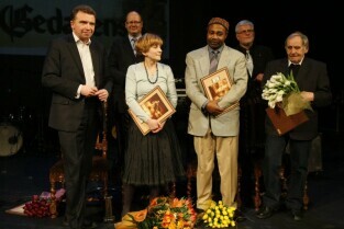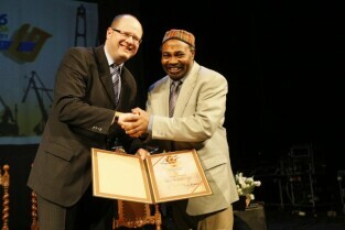 Gdańsk, Teatr Wybrzeże. Nagrody Miasta Gdańska w Dziedzinie Kultury "Splendor Gedanensis" za rok 2009, które wręczył Prezydent Gdańska Paweł Adamowicz. Nagrodę odbiera Lawrence Okey Ugwu - za projekt "Metropolia jest OK." i "Okno na Świat"
