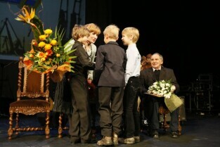 Gdańsk, Teatr Wybrzeże. Nagrody Miasta Gdańska w Dziedzinie Kultury "Splendor Gedanensis" za rok 2009, które wręczył Prezydent Gdańska Paweł Adamowicz. Nz. Anna Podhajska z podoopiecznymi - nagroda za stworzenie w Gdańsku centrum nauczana dzieci gry na skrzypcach metodą Suzuki