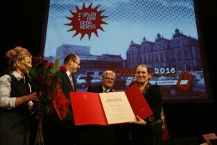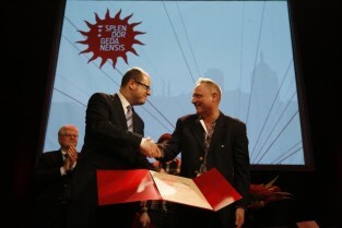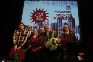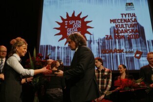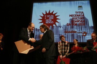 Gala Nagrody Miasta Gdańska w Dziedzinie Kultury "Splendor Gedanensis". Gdańsk, Teatr Wybrzeże. Nz. nagroda dla Rafała Roskowińskiego za budowanie w Gdańsku największej w Polsce galerii malarstwa monumentalnego