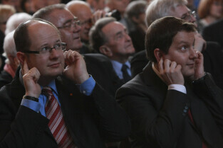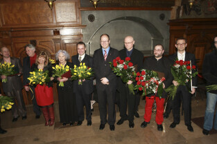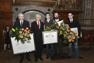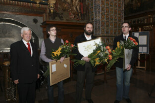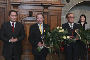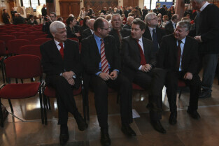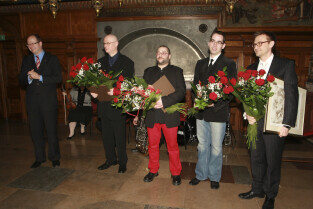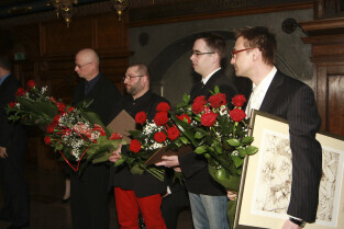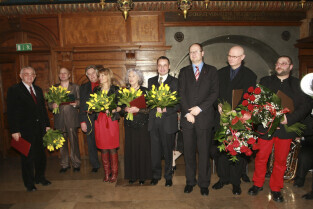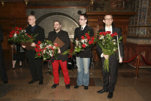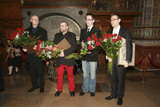 Gdańsk, Dwór Artusa. Nagrody Teatralne Woj. Pomorskiego i Miasta Gdańska. Nz. od lewej: Jan Kozłowski (Marszałek Woj. Pomorskiego), Paweł Adamowicz (Prezydent Gdańska), Michał Owczarczak (Wicewojewoda Pomorski), Bogdan Borusewicz (Marszałek Senatu RP)