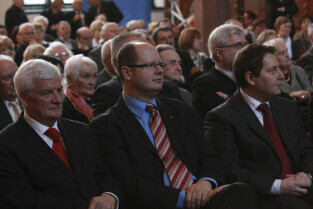Gdańsk, Dwór Artusa. Nagrody Teatralne Woj. Pomorskiego i Miasta Gdańska. Nz. od lewej: Jan Kozłowski (Marszałek Woj. Pomorskiego), Paweł Adamowicz (Prezydent Gdańska), Michał Owczarczak (Wicewojewoda Pomorski)