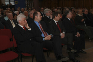 Gdańsk, Dwór Artusa. Nagrody Teatralne Woj. Pomorskiego i Miasta Gdańska. Nz. Paweł Adamowicz (Prezydent Gdańska) i Michał Owczarczak (Wicewojewoda Pomorski) zasłaniący uszy przed hukiem wystrzału z zabytkowej Faluki