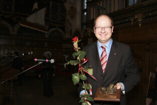 Gdańsk, Dwór Artusa. Nagrody Teatralne Woj. Pomorskiego i Miasta Gdańska. Nz. nagrody wręcza Paweł Adamowicz (Prezydent Gdańska)