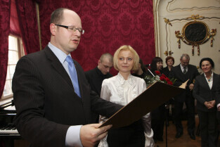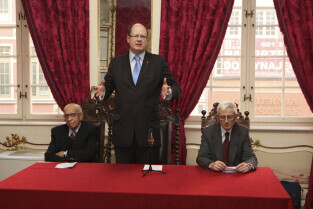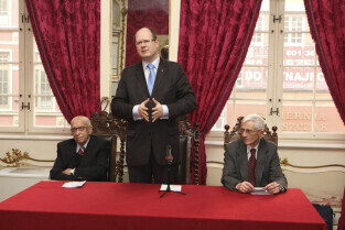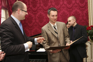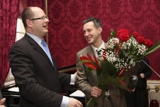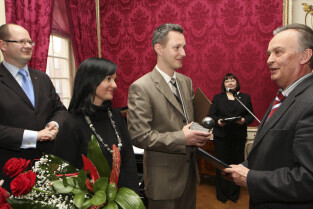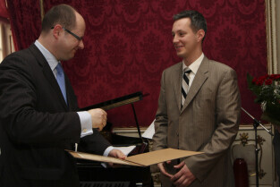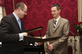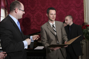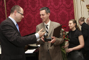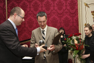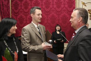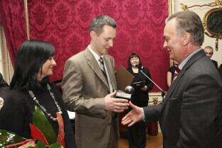 Nagroda Miasta Gdańska im. Jana Uphagena dla młodych naukowców. Nz. nagrodę z rąk Prezydenta Gdańska Pawła Adamowicza odbiera Dr Michał Harciarek