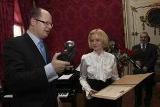 Nagroda Miasta Gdańska im. Jana Uphagena dla młodych naukowców. Nz. nagrodę z rąk Prezydenta Gdańska Pawła Adamowicza odbiera Dr inż. Anna Mietlarek - Kropidłowska