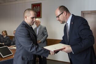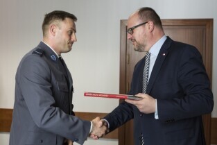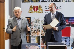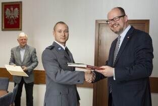 Urząd Miejski w Gdańsku. Prezydent Gdańska Paweł Adamowicz wręcza nagrody dla gdańskich policjantów za walkę z nielegalnym graffiti. Nz. Dyrektor Wydziału Bezpieczeństwa i Zarządzania Kryzysowego UMG Tadeusz Bukontt i p.o. Komendanta Miejskiego Policji w Gdańsku mł. insp. Wojciech Siwek