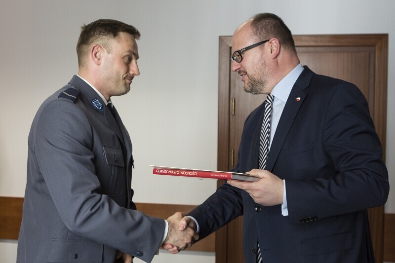 Urząd Miejski w Gdańsku. Prezydent Gdańska Paweł Adamowicz wręcza nagrody dla gdańskich policjantów za walkę z nielegalnym graffiti