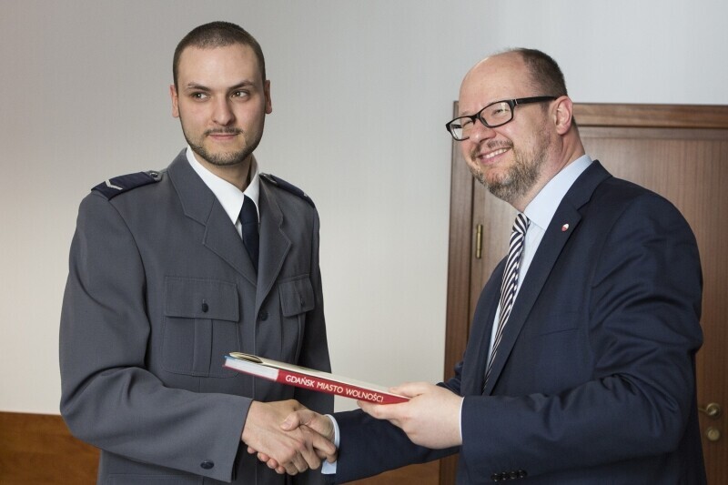 Urząd Miejski w Gdańsku. Prezydent Gdańska Paweł Adamowicz wręcza nagrody dla gdańskich policjantów za walkę z nielegalnym graffiti