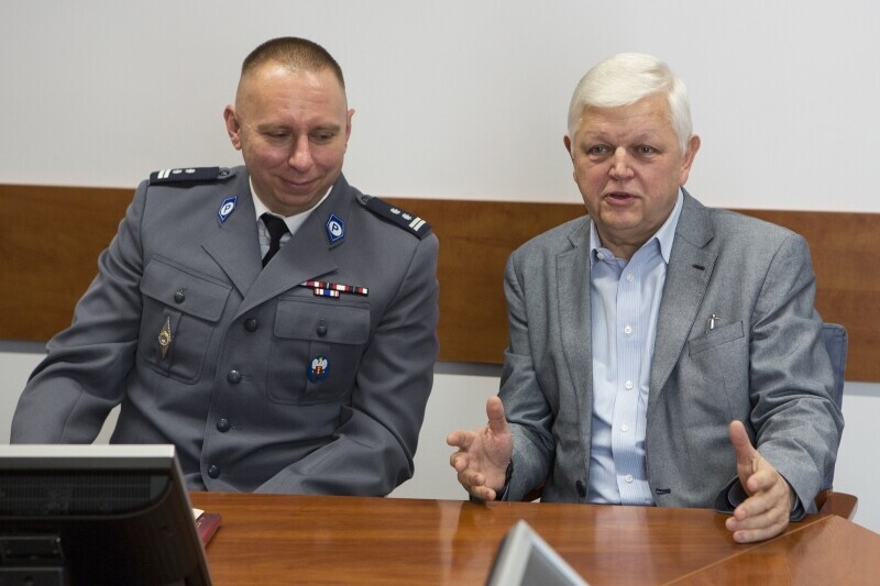 Urząd Miejski w Gdańsku. Prezydent Gdańska Paweł Adamowicz wręcza nagrody dla gdańskich policjantów za walkę z nielegalnym graffiti. Nz. Dyrektor Wydziału Bezpieczeństwa i Zarządzania Kryzysowego UMG Tadeusz Bukontt i p.o. Komendanta Miejskiego Policji w Gdańsku mł. insp. Wojciech Siwek