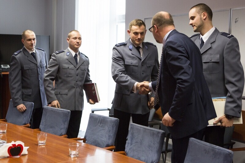 Urząd Miejski w Gdańsku. Prezydent Gdańska Paweł Adamowicz wręcza nagrody dla gdańskich policjantów za walkę z nielegalnym graffiti