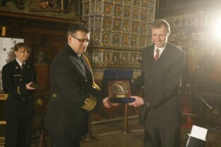 Gdańsk, Dwór Artusa. Uroczystość wręczenia nagród żeglarskich: "Rejs Roku" i "Srebny Sekstant". Nz. z-ca Prezydenta Gdańska Andrzej Bojanowski wręcza II nagrodę "Rejs Roku", którą w imieniu laureata kpt. Andrzeja Lepiarczyka odbiera kpt. Jerzy Kuliński