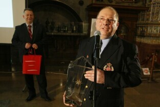 Gdańsk, Dwór Artusa. Uroczystość wręczenia nagród żeglarskich: "Rejs Roku" i "Srebny Sekstant". Nz. z-ca Prezydenta Gdańska Andrzej Bojanowski wręcza nagrodę "Bursztynowa Róża Wiatrów" dla Joseph Conrad Yacht Club z Chicago, którą odbiera komandor kpt. Krzysztof Kamiński