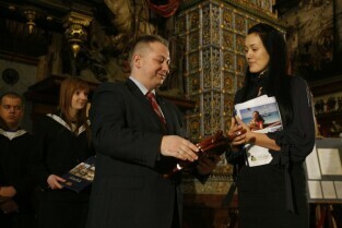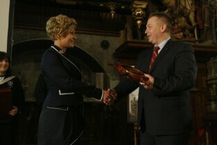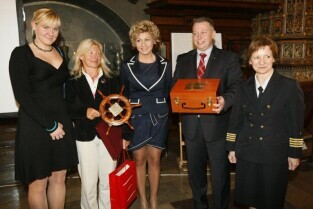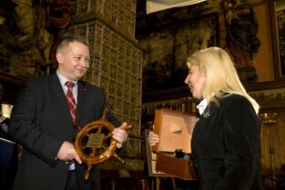 Gdańsk, Dwór Artusa. Uroczystość wręczenia nagród żeglarskich: "Rejs Roku" i "Srebny Sekstant". Nz. z-ca Prezydenta Gdańska Andrzej Bojanowski wręcza III nagrodę "Rejs Roku", którą odbiera kpt. Marta Sziłajtis-Obiegło za rejs dookoła świata