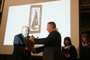 Gdańsk, Dwór Artusa. Uroczystość wręczenia nagród żeglarskich: "Rejs Roku" i "Srebny Sekstant". Nz. nagroda Grotmaszta Bractwa Kaphornowców dla Michała May-Majewskiego, kpt. jachtu "Maytur"