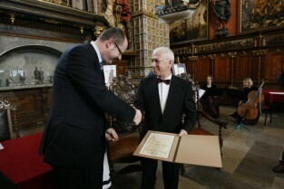 Gdańsk, Dwór Artusa. Nagrody naukowe miasta Gdańska im. Jana Heweliusza. Nz. nagrodę z rąk Prezydenta Gdańska Pawła Adamowicza odbiera Prof. dr hab. Jacek Jassem