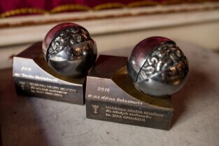 Uroczystość wręczenia Nagrody Miasta Gdańska dla Młodych Naukowców im. Jana Uphagena za rok 2016. Gdańsk, Dom Uphagena. Nz laureat Adrian Bekasiewicz i Piotr Kowalczuk Z-ca Prezydenta ds. polityki społecznej