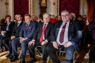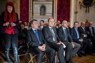 Uroczystość wręczenia Nagrody Miasta Gdańska dla Młodych Naukowców im. Jana Uphagena za rok 2016. Gdańsk, Dom Uphagena. Nz od prawej, Piotr Kowalczuk Z-ca Prezydenta ds. polityki społecznej, Bogdan Borusewicz, Waldemar Ossowski, dyrektor Muzeum Historycznego Miasta Gdańska