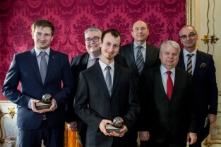 Uroczystość wręczenia Nagrody Miasta Gdańska dla Młodych Naukowców im. Jana Uphagena za rok 2016. Gdańsk, Dom Uphagena. Nz laureaci (pierwszy rząd) Adrian Bekasiewicz i Wacław Kulczykowski, (drugi rząd) Piotr Kowalczuk Z-ca Prezydenta ds. polityki społecznej, Bogdan Borusewicz oraz prof. dr hab. inż. Janusz Smulko (PG) i dr hab. Arnold Kłonczyński, prof. UG