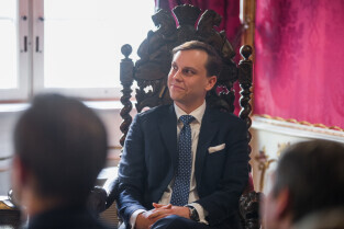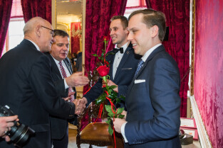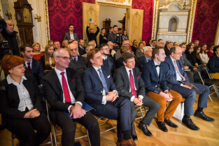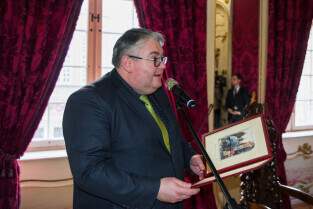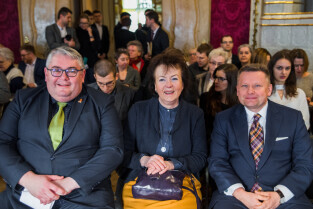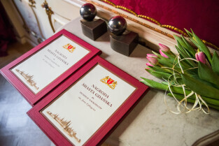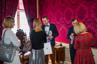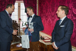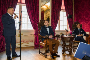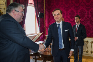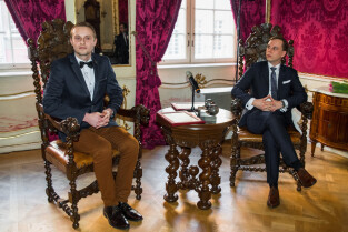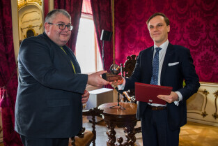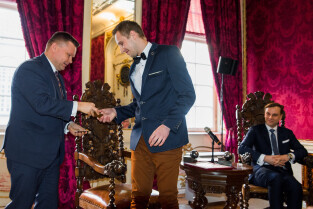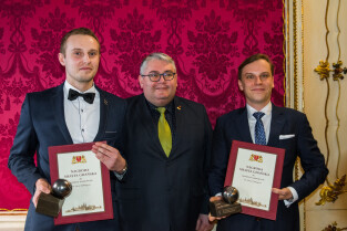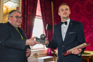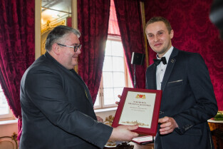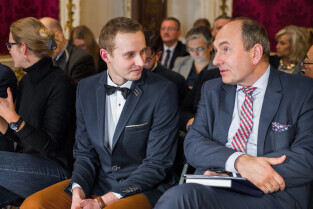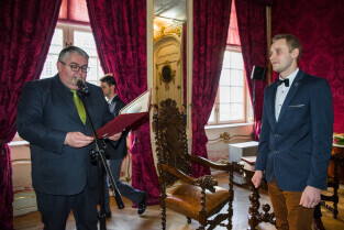 Uroczystość wręczenia Nagrody Miasta Gdańska dla Młodych Naukowców im. Jana Uphagena za rok 2017. Gdańsk, Dom Uphagena. Nz. (od lewej) dr hab. Arnold Kłonczyński rektor UG i laureat mgr Piort Zieliński