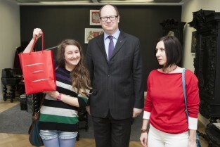 Urząd Miejski w Gdańsku. Prezydent Gdańska Paweł Adamowicz wręczył nagrody w konkursie walentynkowym "Zakochani w Gdańsku”. Nagrodę odbiera Magdalena Afeltowicz za zajęcie I miejsca