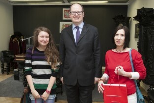 Urząd Miejski w Gdańsku. Prezydent Gdańska Paweł Adamowicz wręczył nagrody w konkursie walentynkowym "Zakochani w Gdańsku”. Po lewej Paulina Przekop (III miejsce), po prawej Magdalena Afeltowicz (I miejsce)