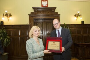 Gdańsk, Nowy Ratusz. Prezydent Gdańska Paweł Adamowicz wręcza nagrody za służbę na rzecz pacjentów. Wyróżnienie za zarządzanie placówką służby zdrowia: Marzena Olszewska-Fryc (Copernicus Podmiot Leczniczy)