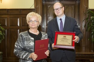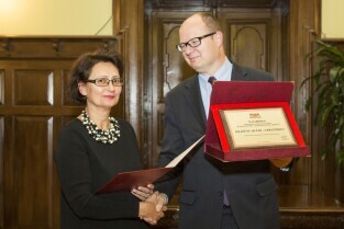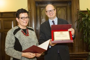 Gdańsk, Nowy Ratusz. Prezydent Gdańska Paweł Adamowicz wręcza nagrody za służbę na rzecz pacjentów. Wyróżnienie: Magdalena Markiewicz (Fundacja Pomorskie Hospicjum dla Dzieci)