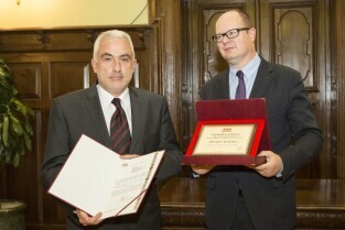Gdańsk, Nowy Ratusz. Prezydent Gdańska Paweł Adamowicz wręcza nagrody za służbę na rzecz pacjentów. Laureat Nagrody głównej dr Tomasz Mazurek (Copernicus Podmiot Leczniczy)