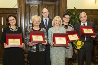 Gdańsk, Nowy Ratusz. Prezydent Gdańska Paweł Adamowicz wręcza nagrody za służbę na rzecz pacjentów. Nz. od lewej: Grażyna Kulik-Urbańska, Barbara Zajet, Prezydent Gdańska Paweł Adamowicz, Marzena Olszewska-Fryc, Magdalena Markiewicz, Tomasz Mazurek