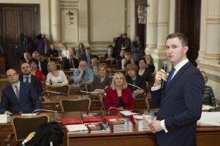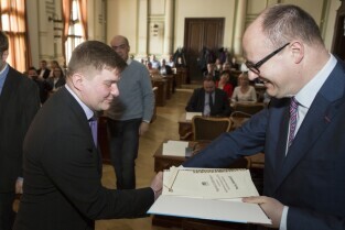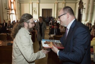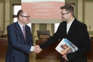 Rozstrzygnięcie konkursu "Najładniejsza elewacja 2014", w którym udział biorą wspólnoty mieszkaniowe. Podziękowania dla zarządcy budynków Pana Rafała Załęskiego za największą ilość remontów elewacji. Gdańsk, Nowy Ratusz