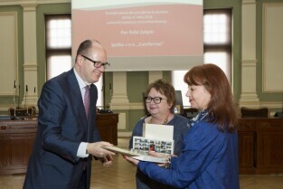 Rozstrzygnięcie konkursu "Najładniejsza elewacja 2014", w którym udział biorą wspólnoty mieszkaniowe. Podziękowania dla przedstawicieli spółki "Euroformat" (zarządcy budynków) za największą ilość remontów elewacji. Gdańsk, Nowy Ratusz