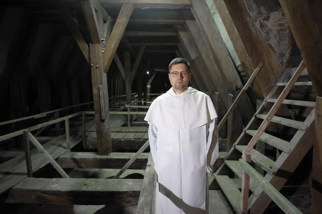 Gdańsk. Naprawione sklepienia w Kościele św. Mikołaja. Nz. Przeor / Proboszcz. o. Michał Osek OP.