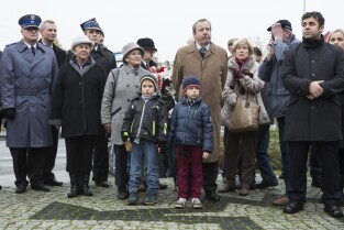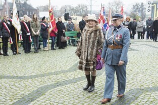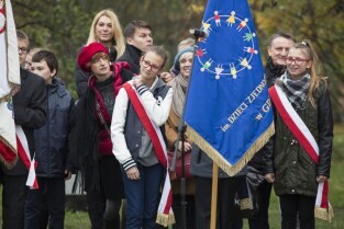 Gdańsk Strzyża. Uroczystość pod pomnikiem marszałka Józefa Piłsudskiego w przededniu Narodowego Święta Niepodległości. Nz. Prezydent Gdańska Paweł Adamowicz z uczestnikami uroczystości