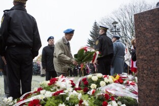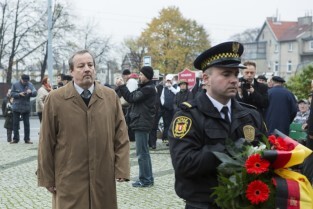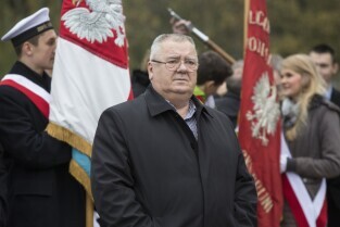Gdańsk Strzyża. Uroczystość pod pomnikiem marszałka Józefa Piłsudskiego w przededniu Narodowego Święta Niepodległości. Nz. Radny Miasta Gdańska Mirosław Zdanowicz