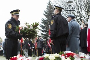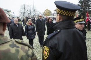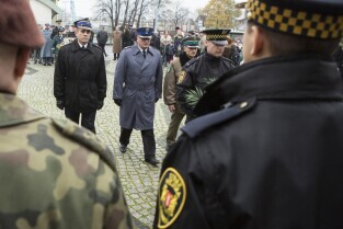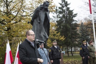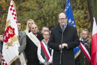 Gdańsk Strzyża. Uroczystość pod pomnikiem marszałka Józefa Piłsudskiego w przededniu Narodowego Święta Niepodległości. Nz. Prezydent Gdańska Paweł Adamowicz