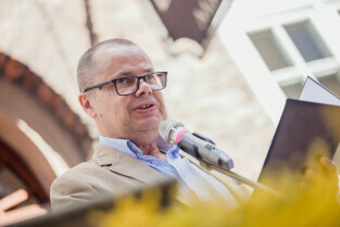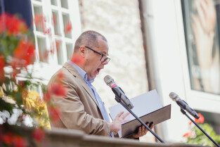 Gdańsk, ul. Mariacka. Narodowe czytanie 2022. A. Mickiewicz “Ballady i Romanse”. Nz. Jarosław Tyrański, aktor związany z Teatrem Wybrzeże