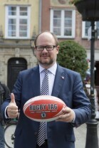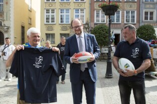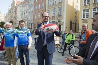 Gdańsk, Długi Targ. Impreza pt. "Nawet Długi Targ jest dla nas za krótki" - ustawione osoby w tzw. "wachlarz" od Złotej Bramy do Bramy Zielonej pobiły rekord Guinessa w podawaniu piłki rugby. Nz. od lewej: Poseł do Parlamentu Europejskiego Jan Kozłowski, Prezydent Sopotu Jacek Karnowski, Prezydent Gdańska Paweł Adamowicz
