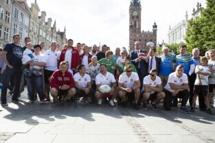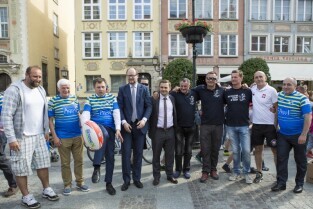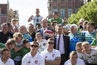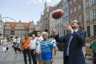 Gdańsk, Długi Targ. Impreza pt. "Nawet Długi Targ jest dla nas za krótki" - ustawione osoby w tzw. "wachlarz" od Złotej Bramy do Bramy Zielonej pobiły rekord Guinessa w podawaniu piłki rugby. Nz. od lewej: Artur Siódmiak, Poseł do Parlamentu Europejskiego Jan Kozłowski, Prezydent Sopotu Jacek Karnowski, Prezydent Gdańska Paweł Adamowicz, Burmistrz Rumi Michał Pasieczny, Prezes Rugby Club Lechia Gdańsk Bogdan Jancen, Zbigniew Gutkowski; po prawej: Trener Reprezentacji Polski w Rugby 7 Krzysztof Folc i Prezes Saur Neptun Gdańsk Serge Bosca