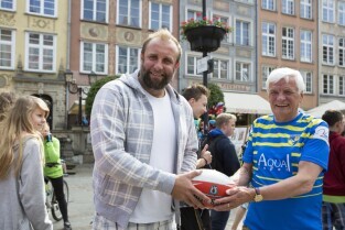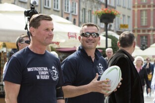 Gdańsk, Długi Targ. Impreza pt. "Nawet Długi Targ jest dla nas za krótki" - ustawione osoby w tzw. "wachlarz" od Złotej Bramy do Bramy Zielonej pobiły rekord Guinessa w podawaniu piłki rugby. Nz. Artur Siódmiak i Poseł do Parlamentu Europejskiego Jan Kozłowski