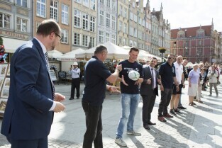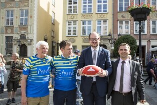 Gdańsk, Długi Targ. Impreza pt. "Nawet Długi Targ jest dla nas za krótki" - ustawione osoby w tzw. "wachlarz" od Złotej Bramy do Bramy Zielonej pobiły rekord Guinessa w podawaniu piłki rugby. Nz. od lewej: Poseł do Parlamentu Europejskiego Jan Kozłowski, Prezydent Sopotu Jacek Karnowski, Prezydent Gdańska Paweł Adamowicz, Burmistrz Rumi Michał Pasieczny