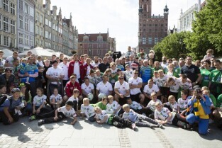 Gdańsk, Długi Targ. Impreza pt. "Nawet Długi Targ jest dla nas za krótki" - ustawione osoby w tzw. "wachlarz" od Złotej Bramy do Bramy Zielonej pobiły rekord Guinessa w podawaniu piłki rugby