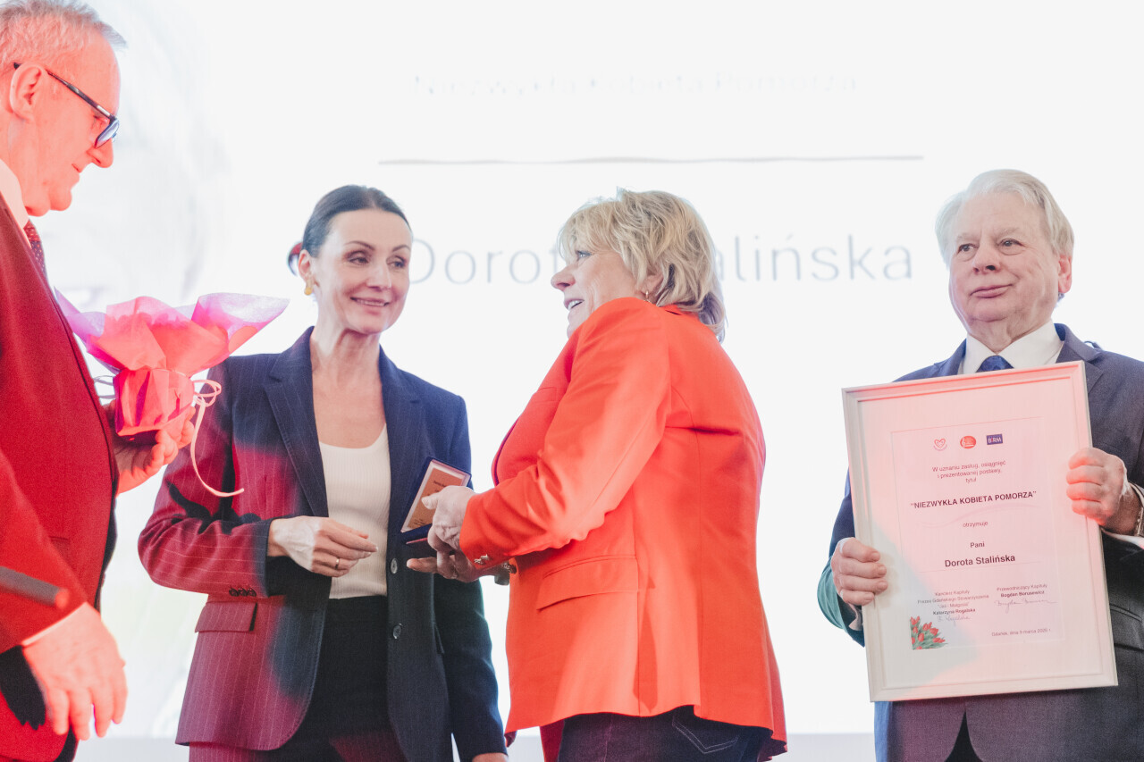 Gdańsk, OBC. Niezwykłe Kobiety Pomorza. Podczas wieczoru wojewoda pomorska Beata Rutkiewicz oraz marszałek Bogdan Borusewicz wręczyli medale "Człowiek Wspaniałego Serca i Wielkiego Czynu".