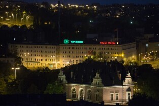 Gdańsk. Widok z wieży Kościoła św. Karzyny, który możabyło obejrzeć podczas Europejskiej Nocy Muzeów. Nz. siedziba Centrum Techniki Okrętowej S.A., tzw. Zieleniak