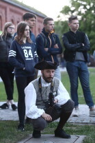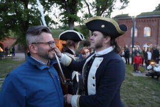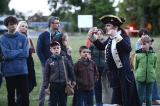 Noc Muzeów 2018 w Gdańsku. Centrum Hewelianum-pokaz grupy rekonstrukcyjnej Garnizon Gdańsk. Nz. Dyrektor Centrum Hewelianum Paweł Golak.