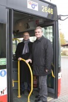 Gdańsk, Ujeścisko. Oddanie do użytku nowej pętli autobusowej. Od soboty, 10 listopada, autobusy linii 118 będą jeździły do pętli przy ul. Piotrkowskiej znajdującej się w głębi osiedla. Nz. (od lewej) zastępca Prezydenta Gdańska Maciej Lisicki i Przewodniczący Rady Miasta Gdańska Bogdan Oleszek.