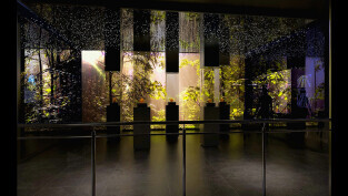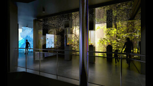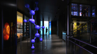 Cząsteczka bursztynu na poziomie pierwszym, w tle las bursztynowy w nowym Muzeum Bursztynu