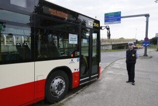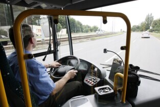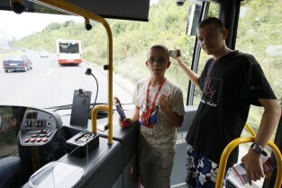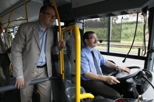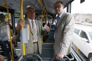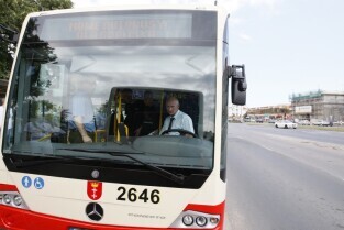 Prezentacja i specjalny przejazd 8 nowych przegubowych autobusów Mercedes ConectoG, które zakupił Zakaład Komunikacji Miejskiej w Gdańsku. Nz. Prezydent Gdańska Paweł Adamoiwcz, autobus prowadzi Andrzej Walczukiewicz